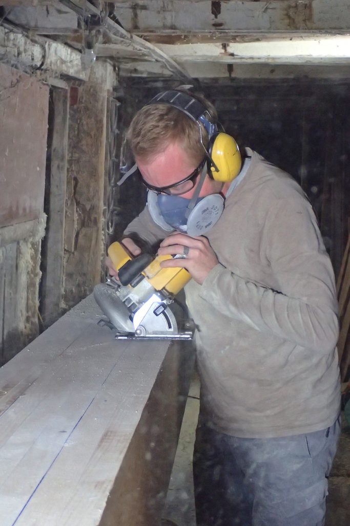 The challenge with tapering our beam was to cut through 11.25inch of wood. We debated which tool to use; handsaw, skillsaw, reciprocal saw…? It end up being the chain saw. Off course, the cut was not clean and Mark left enough material to tidy it with the planer to the line.