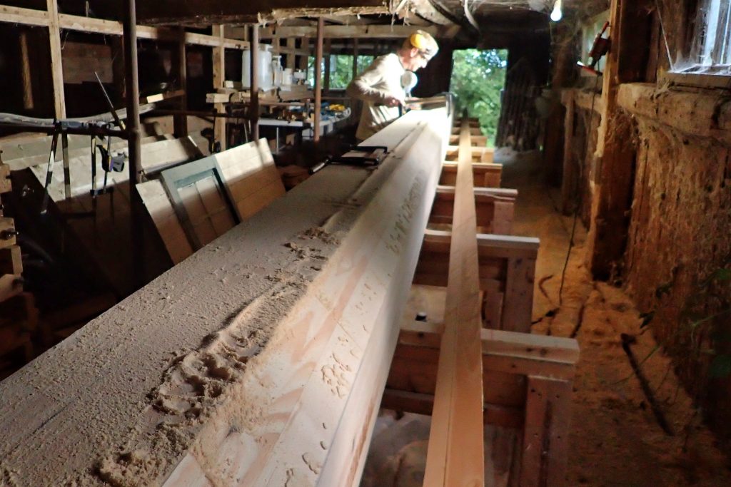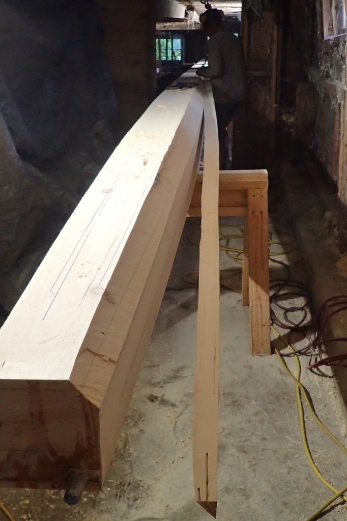The mast is 55ft long. It is impossible to purchase planks that long so we must “piece up” multiple planks to make the length. Each plank joint is a 12 to 1 scarf.